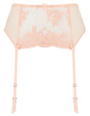 Amélie: the wildest romance sweeps together with explosive force is this powerfully beautiful collection of apricot rose. This suspender is an artwork, with meticulously embroidered flowers that trace over Mimi Holliday’s exclusive web lace, enveloping the body in contemporary, yet whimsical, romance. The angelic silhouette and strong line of this suspender is designed to flatter, creating and enhancing curves with devastating effect. Be prepared to be adored.