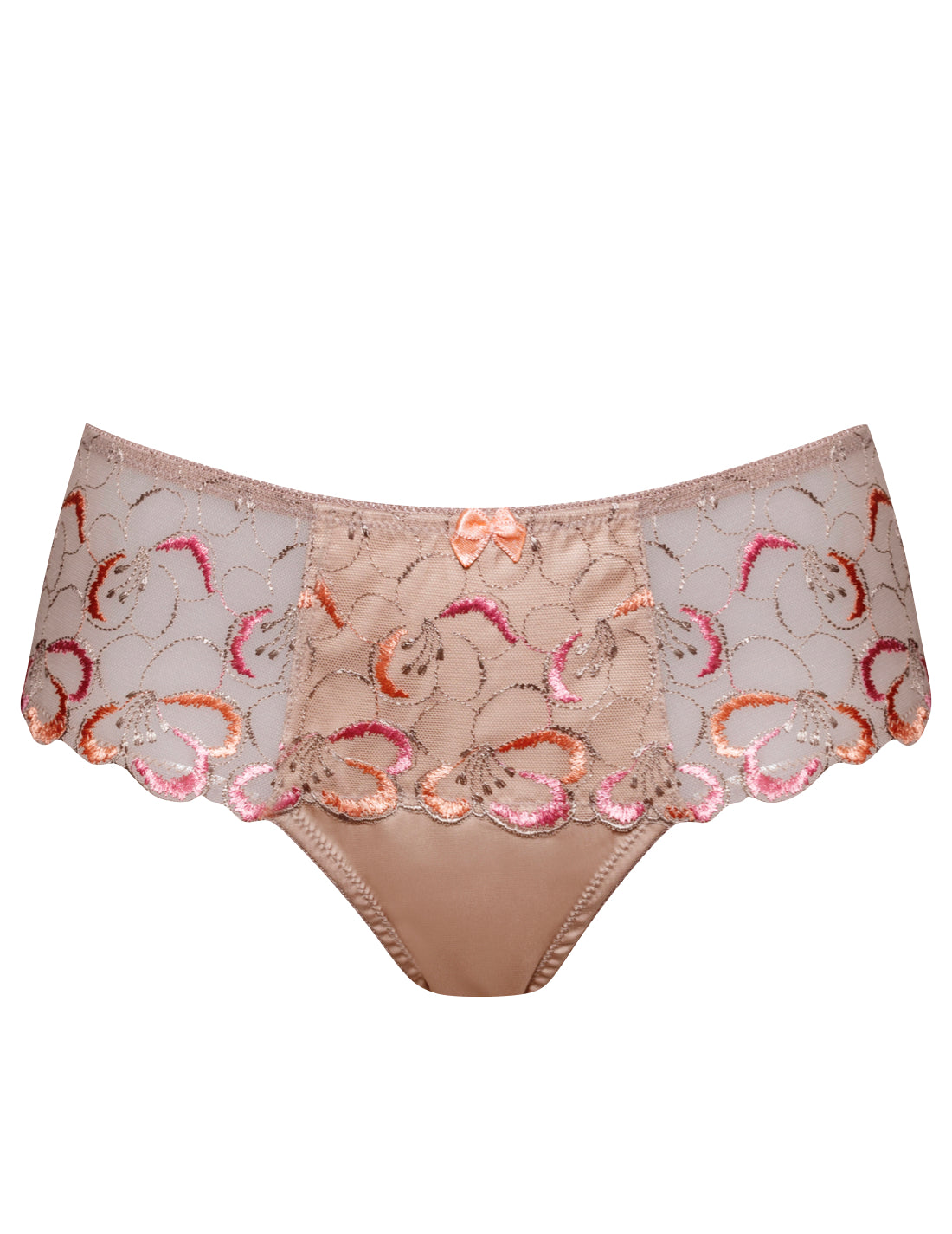 Delicate floral embroidery in pink and orange creates a stunning effect in our Amour Naturel boyshort. A cheeky yet subtle thong style, the boyshort sculpts and flatters to create a pert and perfectly peachy derriere. Always full of Mimi style surprises, the boyshort features our trademark, playful peep hole at the back.